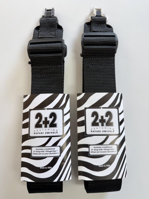 The 2+2 features two Safari Swivels and a traditional 2″ black webbing sling.